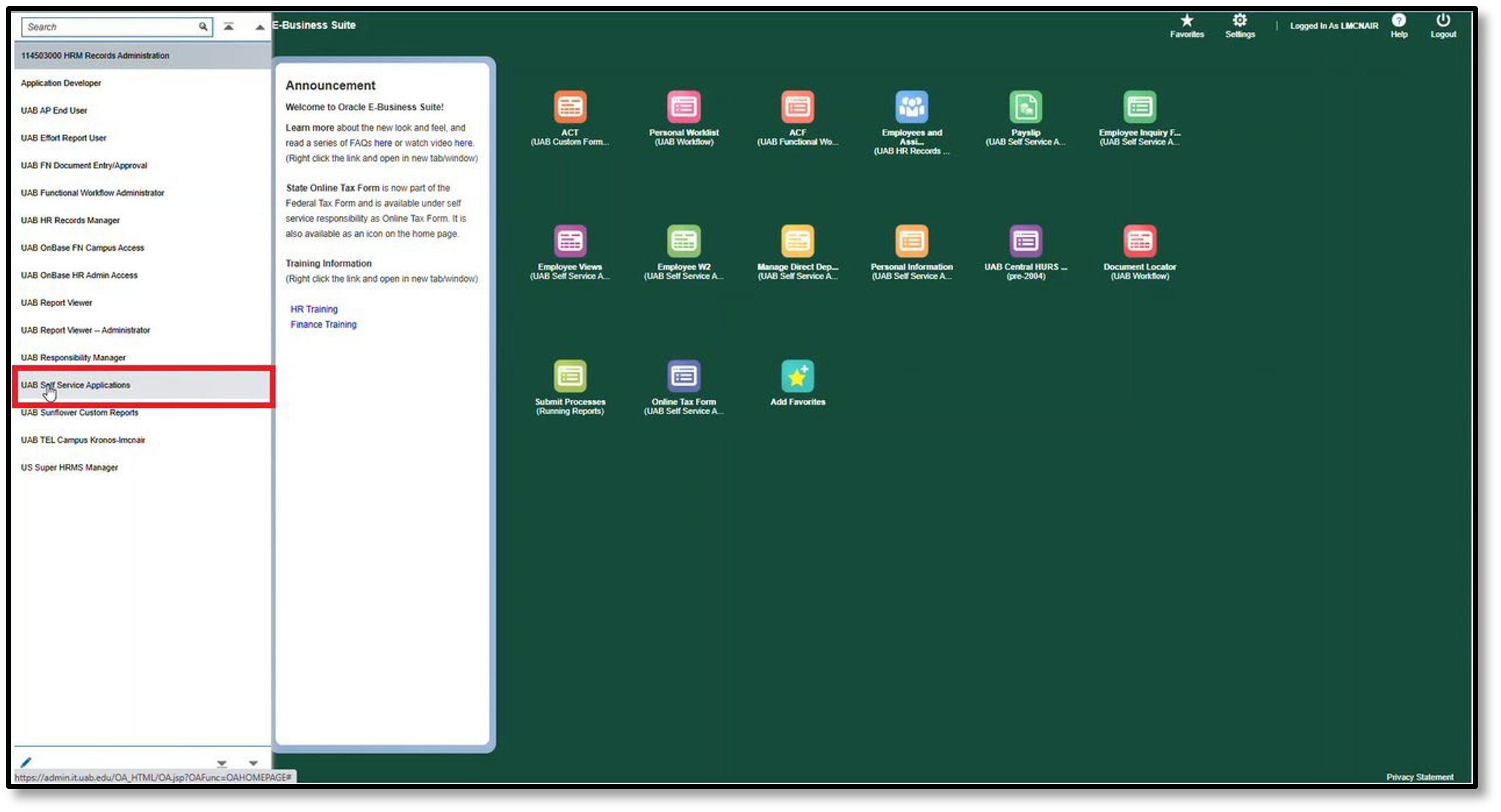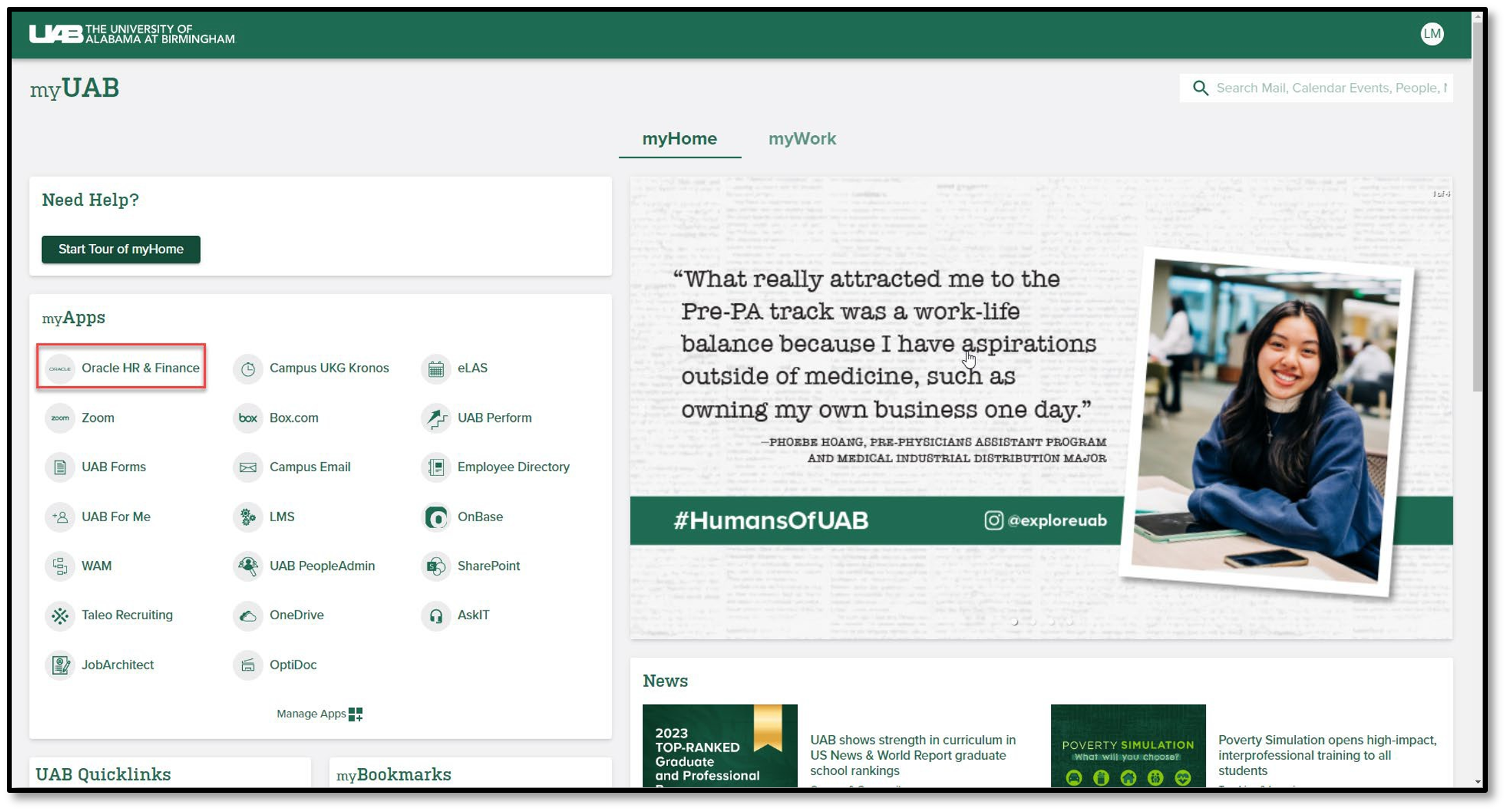 - Go to the myUAB portal and select Oracle HR & Finance. (If it is not in your myApps section, select Manage Apps and add it to your myApps.)