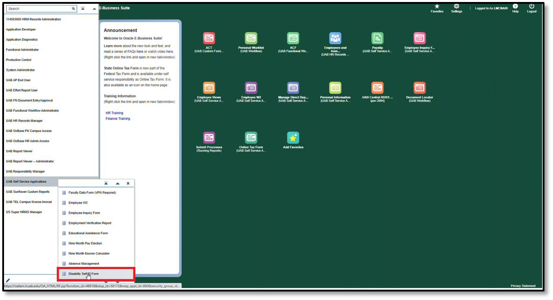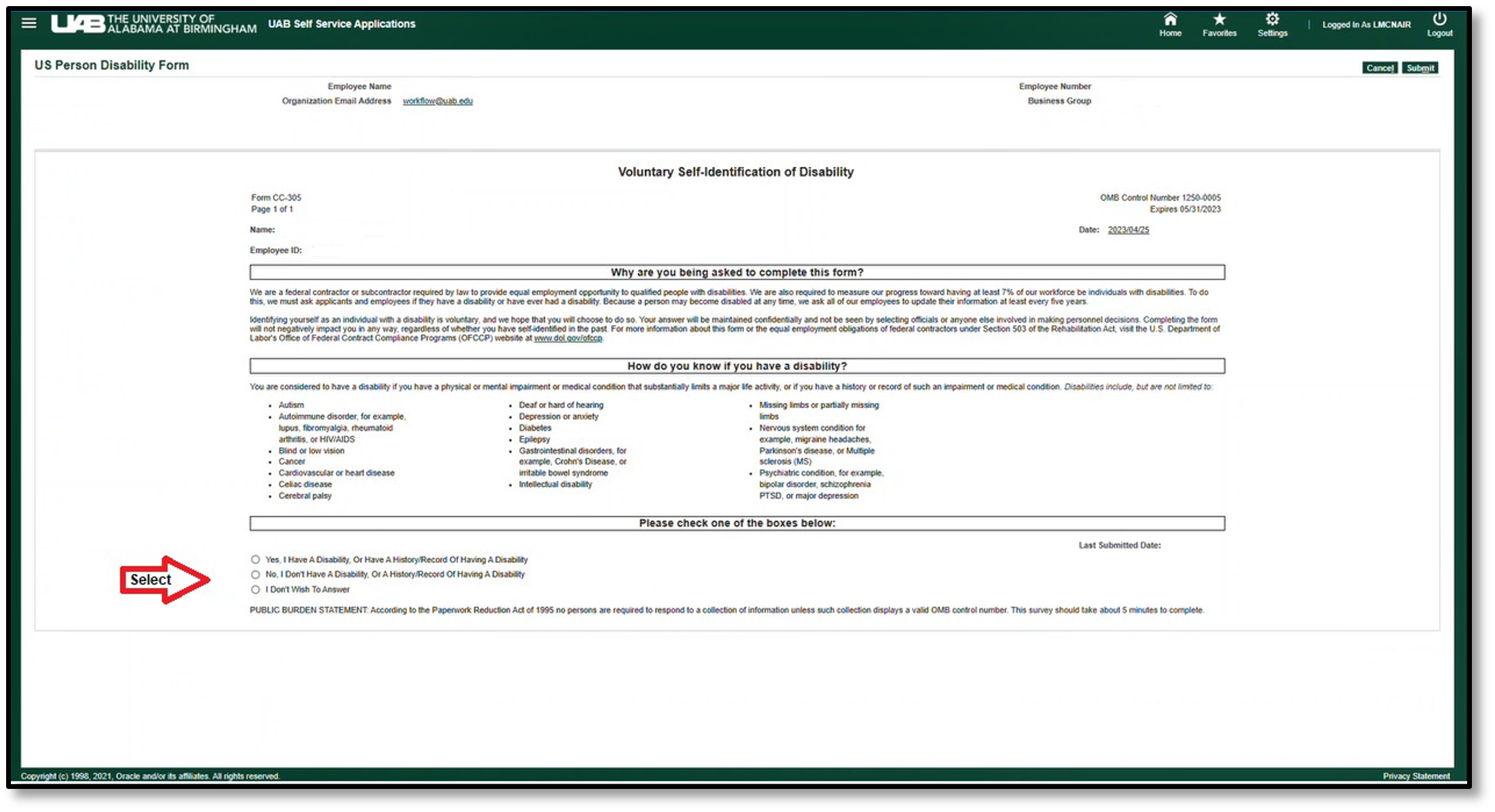 This step guide should be used to complete the Disability Self ID Form in the Oracle HR & Finance System. These steps should be used to provide and/or update your disability status as needed throughout your career at UAB.
