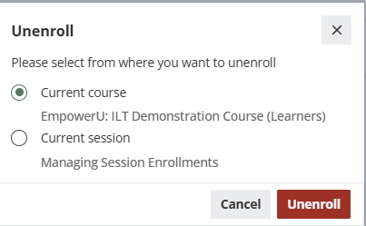 Notes: • If you already completed a session, you can re-enroll in an available session. Your completion certificate will not be updated. • If you do not see the option to unenroll, the course does not allow self-unenrollment. Contact the Course Contact for assistance.